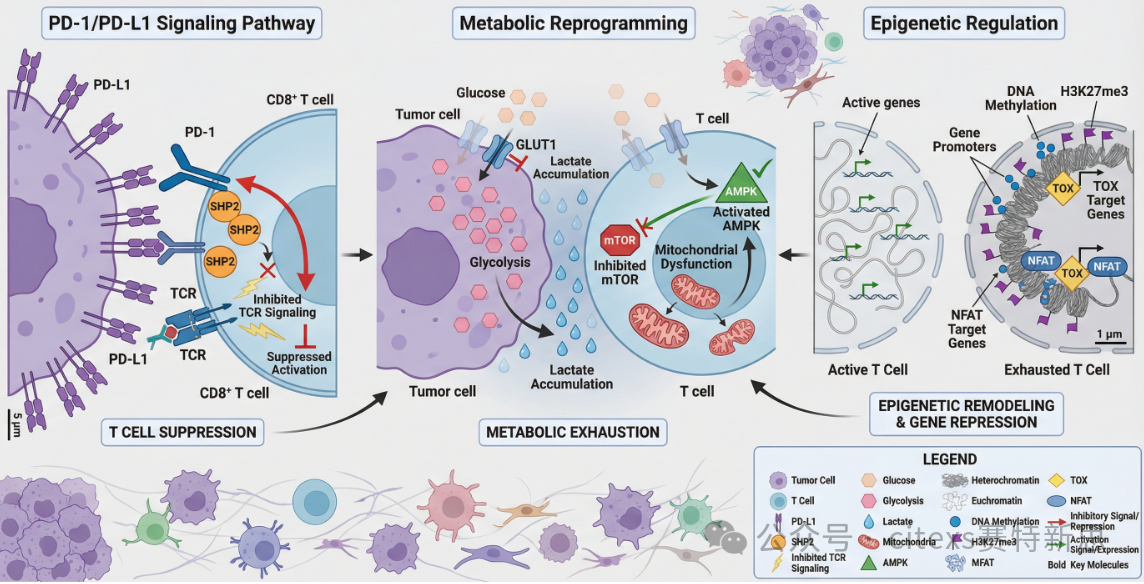 再例如:"绘制肿瘤微环境中T细胞耗竭的分子机制图,包括PD-1/PD-L1通路、代谢重编程和表观遗传调控三个层面"