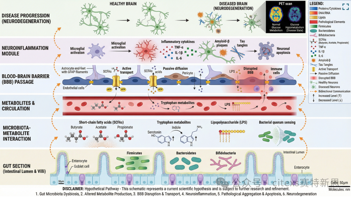研究肠道菌群与神经退行性疾病的关系,可以生成包含"肠道-肠道菌群-代谢产物-血脑屏障-神经炎症-疾病进展"的多层次示意图,清晰展现"肠-脑轴"假说。