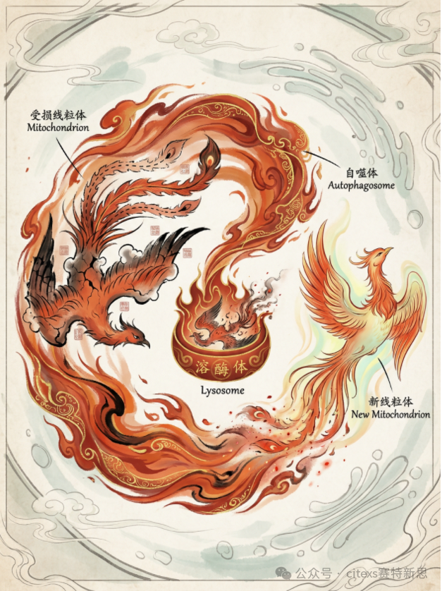 (封面解读:细胞中的凤凰不断涅槃——当线粒体这座'能量工厂'积累损伤,自噬之火便会点燃,将衰老的'凤凰'送入溶酶体的烈焰。灰烬中,新生的线粒体如雏凤重生,延续生命的能量循环。图源:citexs赛特新思官网)